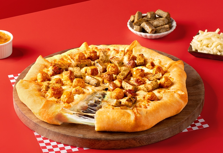 Crust filled with creamy cheese, base loaded with gooey liquid cheese, topped with mozzarella cheese, herbed chicken, schezwan chicken meatball & chicken tikka